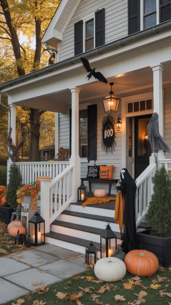Repeat your story outside so guests feel the mood right away. Place black lanterns by the door or walkways, add a cluster of outdoor pumpkins on the steps, hang a large fall wreath on the door.