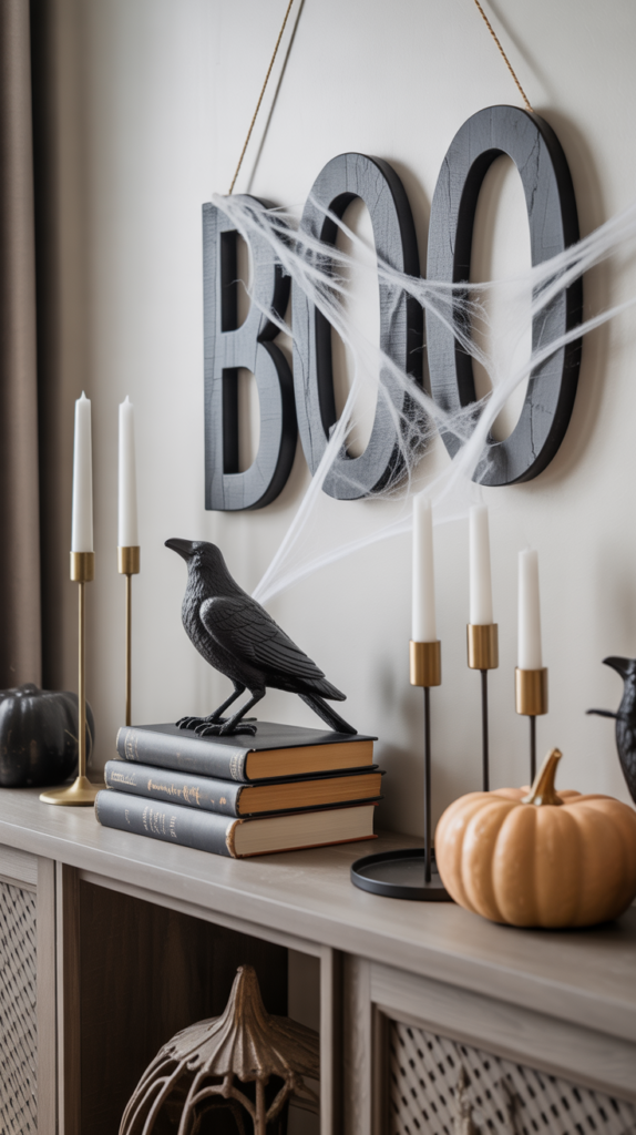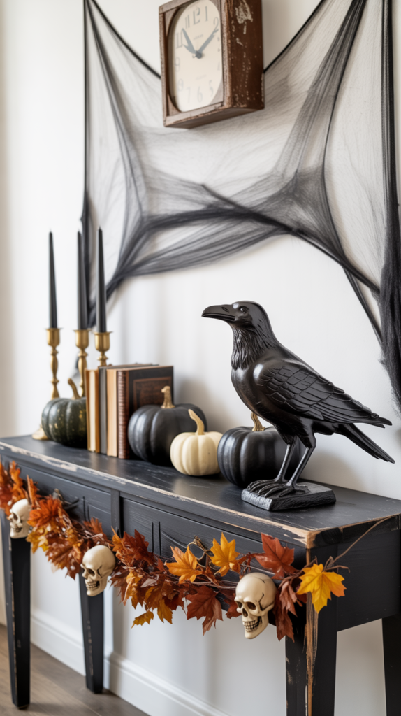 For a touch of Halloween drama, add a decorative black raven near your books or lanterns. Its presence can bring an eerie and captivating spooky charm vibe to your decor.