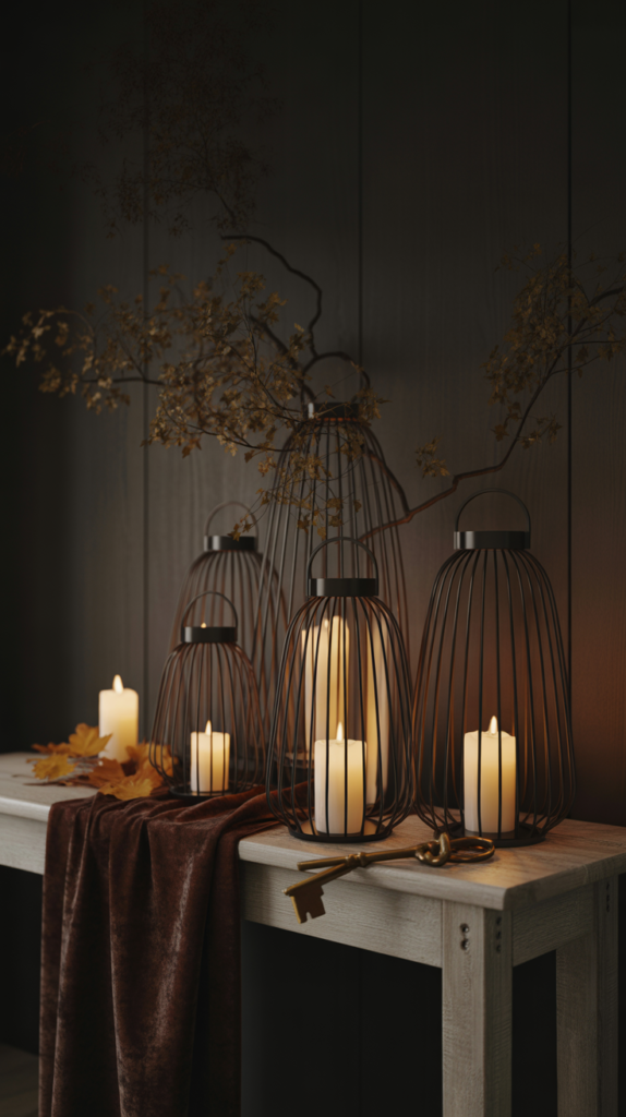Black Lanterns bring height and glow. Use two or three in different sizes. Place them on the floor beside the table or line them down the hallway to draw the eye.