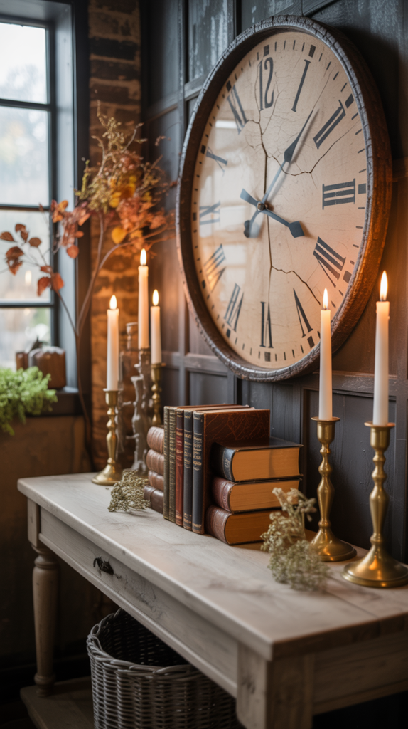 Hang a wooded or cracked clock above the entryway table to set the tone. It feels aged and a little mysterious.