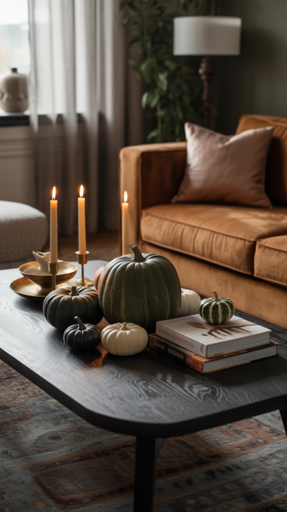 Mix matte black pumpkins with deep green pumpkins for a rich palette. Add a few small white mini pumpkins for balance. Keep sizes varied to build a natural rhythm across the tabletop.