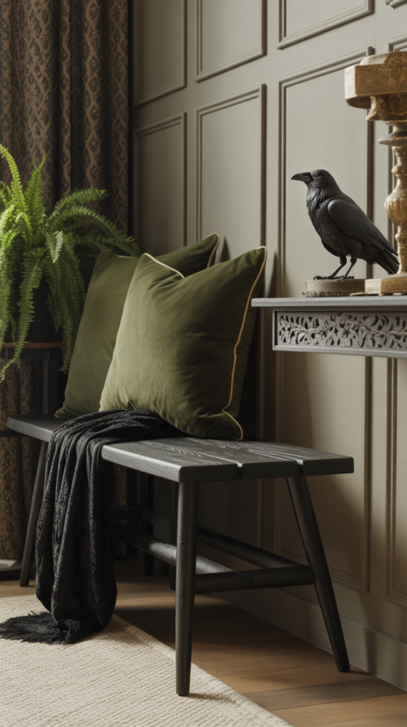 Carry the theme to nearby seating or if you have a entryway bench. Velvet throw pillows are a great way to introduce both color and texture to your decor. With rich tones like deep green, burgundy, or black, you’ll be sure to set the Ghoulish vibe.