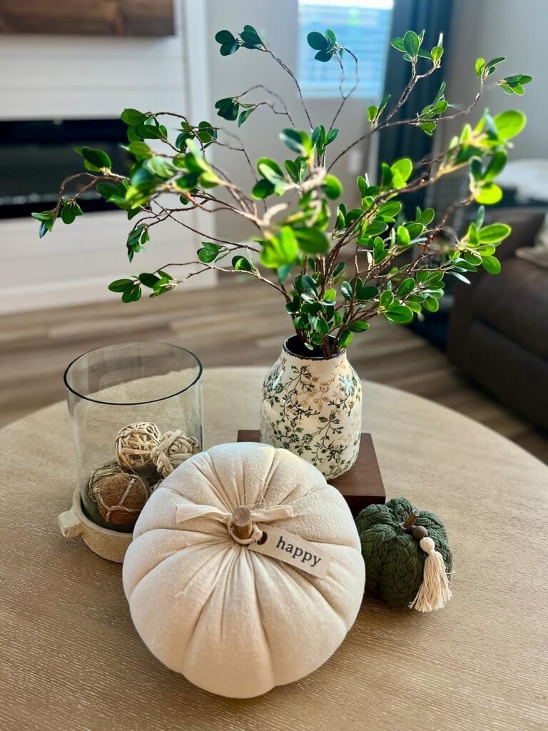 A rustic farmhouse vase paired with faux stems is one of the simplest ways to bring a natural fall look into your home. Choose a vase with earthy textures like ceramic, stone, or matte pottery in warm neutral tones.